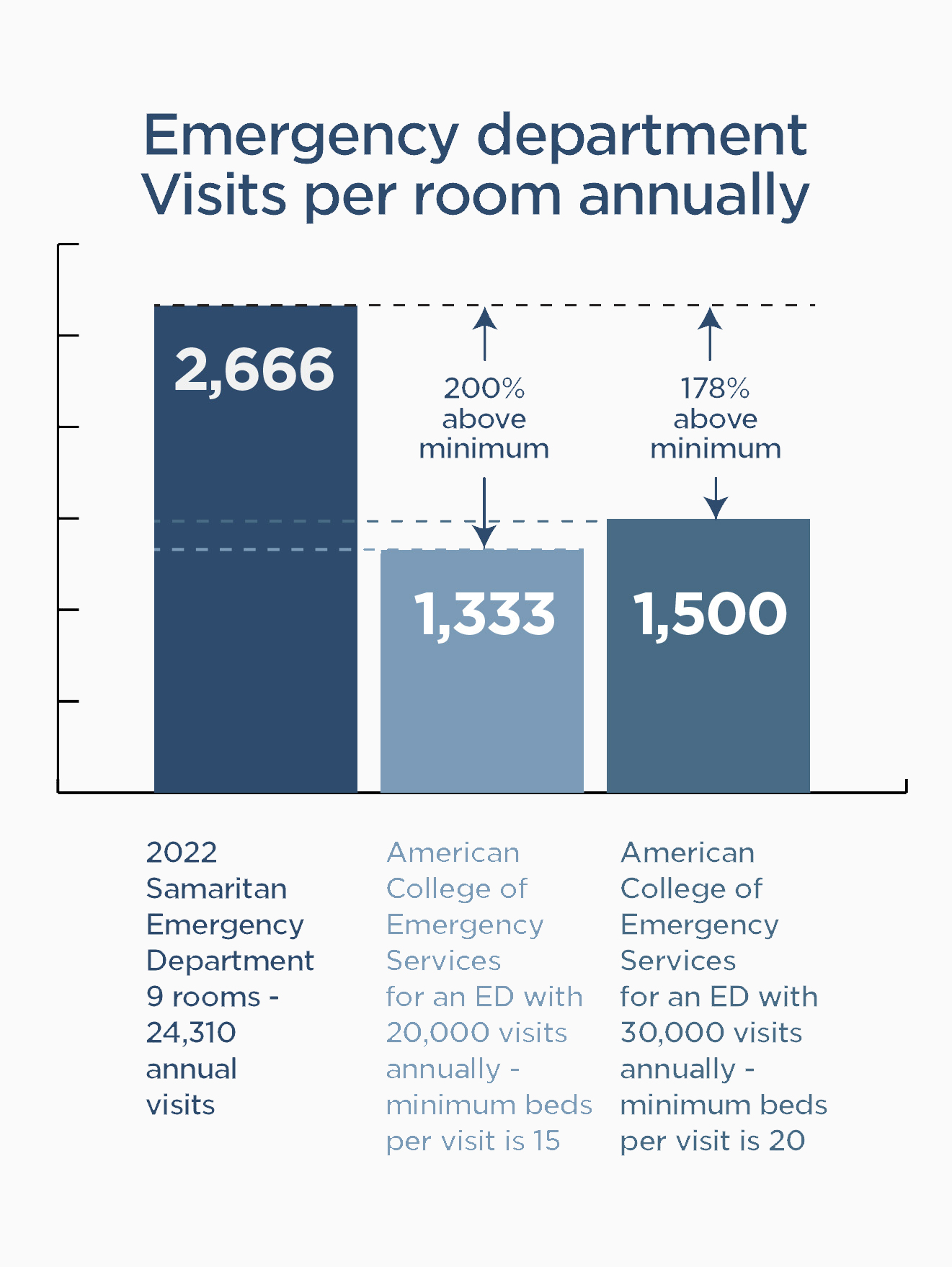 Our community is surging from a population growth perspective, and we need to plan for both today and the future. American College of Emergency Services recommends that an ED with 20,000 visits annually should have a minimum of 15 beds. Samaritan is operating significantly above these numbers—200% above the 1,333 visits per room minimum for 20,000, and 178% above the minimum for 30,000 visits.