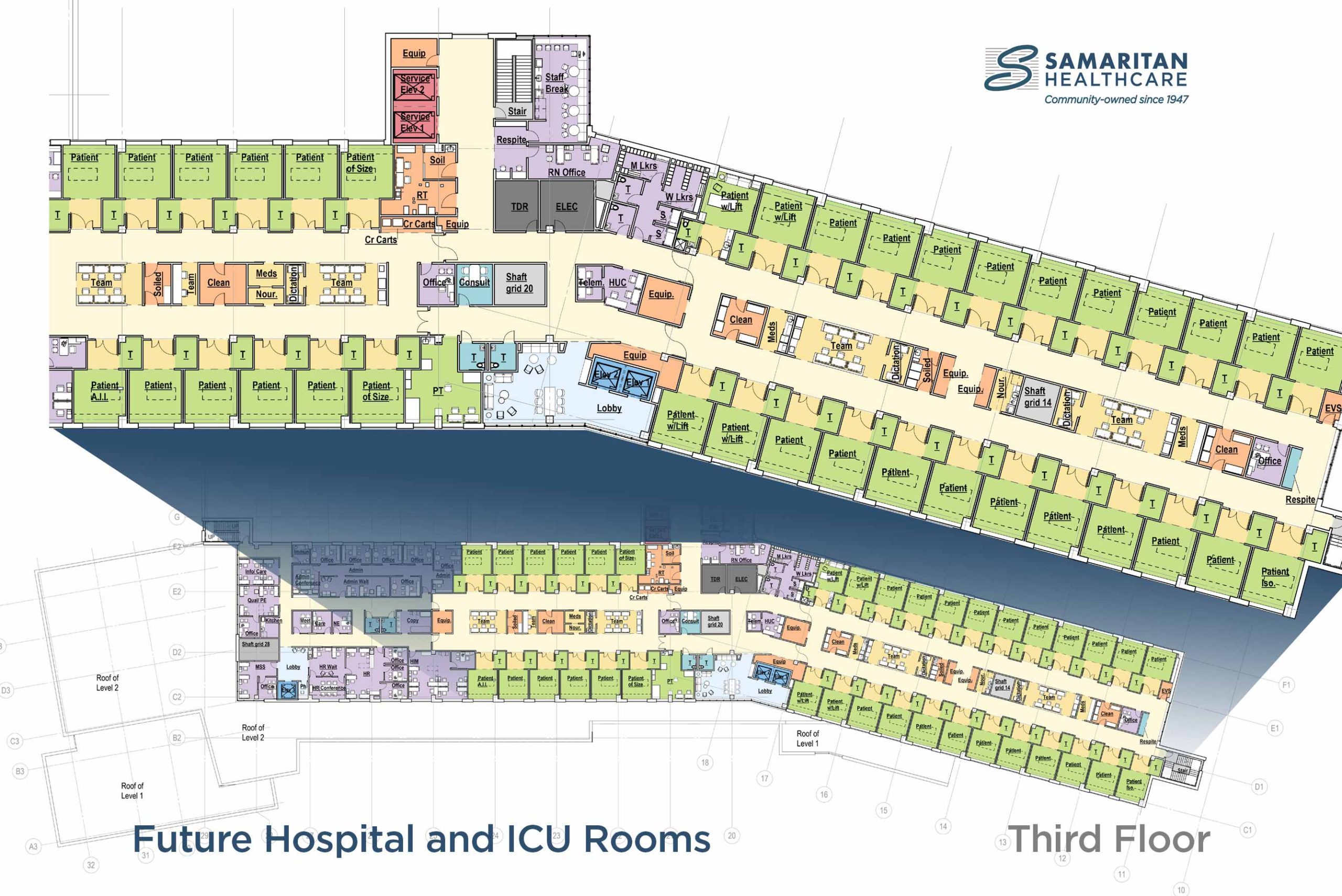 The 3rd floor is designed to be flexible and can expand to 10 beds depending on patient needs. Being flexible means the ICU and patient hospital rooms are on the same floor, and are built the same. An ICU room can become a patient room, and a patient room can become an ICU room. If the ICU is full, ICU can use available patient rooms and vice versa.